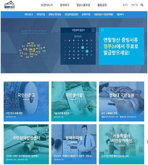 행정안전부는 기관별로 운영되는 각종 국민참여 사이트를 통합·안내하고 정부 정책 제안과 토론이 가능한 정부대표 국민참여사이트인 ‘광화문1번가 국민참여플랫폼(온라인 광화문1번가)’을 31일 개시한다고 30일 밝혔다.