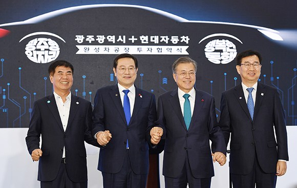 이날 오후 2시30분 광주시청 1층 로비에서 열린 투자 협약식 ‘행복한 동행’에는 문재인 대통령을 비롯 광주광역시, 현대자동차, 중앙부처 관계자, 지역인사 등 400여명이 참석했다.