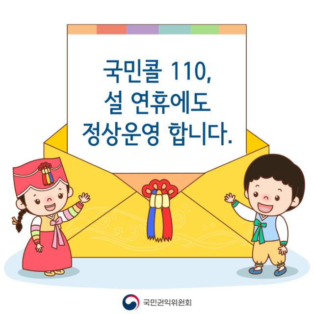국민권익위 황호윤 서울종합민원사무소장은 “국민콜 110은 매년 약 325만 여명이 이용하는 정부 대표상담 서비스로서 설 연휴에도24시간 정상 운영되는 만큼 많은 국민들이 궁금한 사항이나 신고 관련 문의가 있을 때 언제든지 편리하게 이용할 수 있을 것”이라고 말했다.