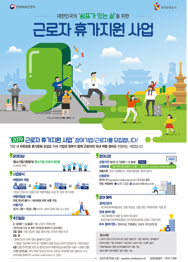 [일간환경연합 장민주 기자]문화체육관광부는 한국관광공사와 함께 오는 12일부터 3월 8일까지 ‘근로자 휴가지원 사업’에 참여할 중소기업 및 소상공인 근로자 8만 명을 모집한다.