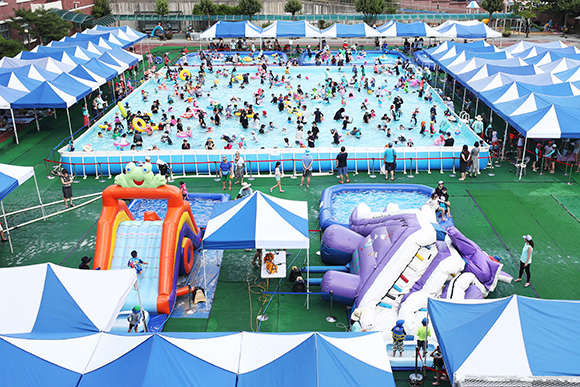 지난해 8월 서울 성북구 숭덕초 운동장에 설치된 대형 풀장에서 시민들이 즐거운 시간을 보내고 있다. (사진=(c) 연합뉴스) |