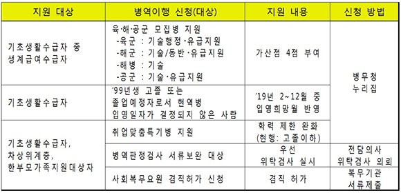 지원 대상별 내용 및 신청 방법. (출처=병무청) |