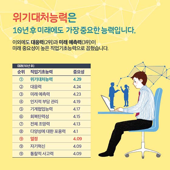 5년 전만 하더라도 가장 중요하게 여겨지는 능력은 ‘열정’이었습니다. 현재에 가장 중요하게 꼽히는 직업능력은 뭘까요? 바로 ‘위기대처능력’입니다. 위기 상황이 예견되거나 피해를 보는 와중에도 침착하게 문제를 극복해나가는 능력을 말합니다.