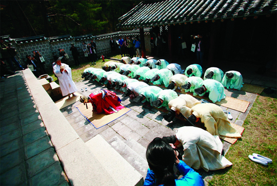 | 2013년 5월 5일 탕평책 상징인 ‘도산별과’ 재현 행사에 앞서 퇴계 이황의 위패를 모신 도산서원 상덕사에서 퇴계에게 행사를 알리는 고유제를 올리고 있다.(사진=한국학진흥원) |