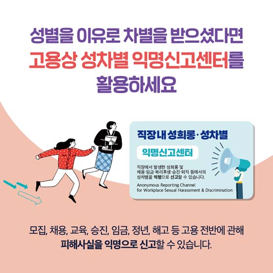 모집, 채용, 교육, 승진, 임금, 정년, 해고 등 고용 전반에 관해 피해사실을 익명으로 신고할 수 있습니다.