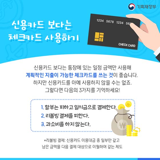◇ 신용카드보다는 체크카드 사용하기 신용카드보다는 통장에 있는 일정 금액만 사용해 계획적인 지출이 가능한 체크카드를 쓰는 것이 좋습니다. 하지만 신용카드를 아예 사용하지 않을 수는 없죠. 그렇다면 다음의 3가지를 기억하세요!