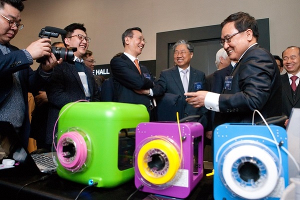 유영민 과학기술정보통신부 장관(오른쪽)이 21일 연세대학교 백양누리에서 열린 ‘실험실 창업 페스티벌 랩스타트업(LAB Start-Up) 2019’에서 임정수 유씨드 대표이사(왼쪽 두 번째)로부터 음성 AI 3D 프린터에 대한 설명을 듣고 있다.(사진=과학기술정보통신부) |