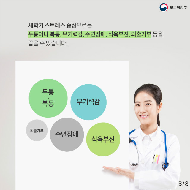 그뿐만 아니라 공부, 친구, 통학 거리, 선생님, 부모님 등 다양한 요소가 원인일 수 있기 때문에 새학기 스트레스 완화를 위해서는 무엇보다 가정에서의 교육이 중요합니다.