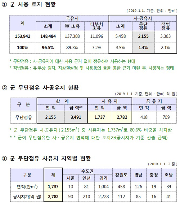 군의 무단점유 문제는 과거 한국전쟁 이후 군부대 창설·정비 과정에서 경계측량 미실시와 긴급한 작전수행, 토지 소유자 거소불명 등으로 불가피하게 사용된 측면이 있다.