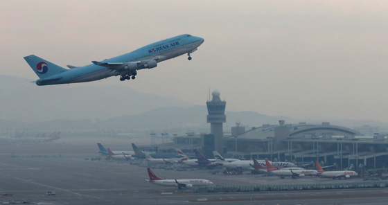 인천공항 계류장 옆 활주로에서 항공기가 이륙하고 있다.(사진=(c) 연합뉴스) |