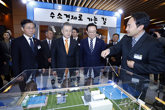 문재인 대통령이 지난 1월 17일 오전 울산시청 대회의실에서 열린 ‘수소 경제와 미래 에너지, 울산에서 시작됩니다’ 행사에 참석하기에 앞서 수소 활용 전시장을 둘러보고 있다. 문 대통령이 수전해발전시스템에 대한 설명을 듣고 있다. (사진=(c) 연합뉴스) |
