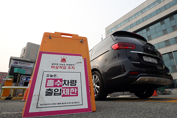 4일 전국 9개 시·도에 미세먼지 비상저감조치가 발령된 가운데 광주시 광산구청 입구에 차량 2부제 안내판이 설치돼 있다. (사진=(c) 연합뉴스) |