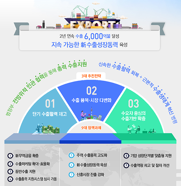 수출활력 제고 대책은 수출활력을 최대한 회복하고, 나아가 2년 연속 수출 6000억 달러를 달성하기위한 다양한 지원방안이다.