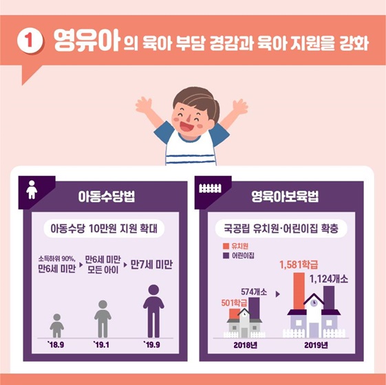 ① 영유아의 육아 부담 경감과 육아 지원을 강화- 아동수당법: 아동수당 10만 원 지원 확대
