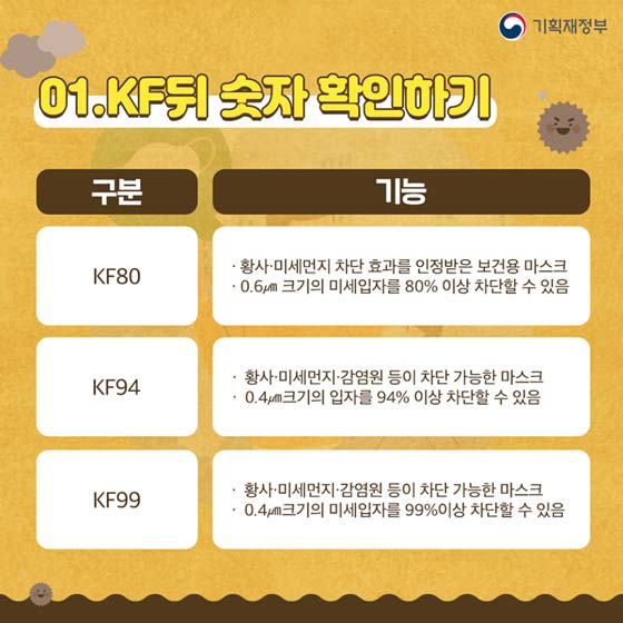 1. KF 뒤 숫자 확인하기- KF80 : 황사·미세먼지 차단 효과를 인정받은 보건용 마스크. 0.6㎛ 크기의 미세입자를 80% 이상 차단할 수 있음.