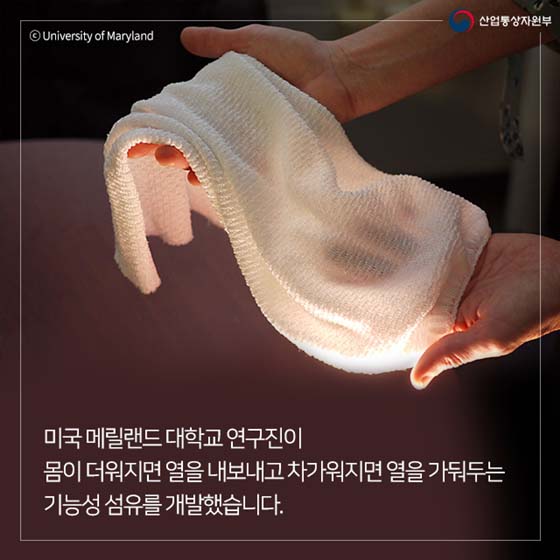 [일간환경연합 장민주 기자]요즘 날씨, 일교차가 심해서 옷 입기 곤란하시죠? 미국 메릴랜드 대학교 연구진이 몸이 더워지면 열을 내보내고 차가워지면 열을 가둬두는 기능성 섬유를 개발했습니다.