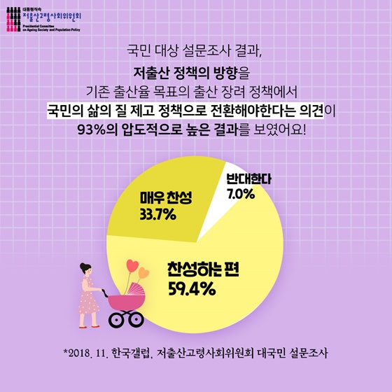 국민 대상 설문조사 결과, 저출산 정책의 방향을 기존 출산율 목표의 출산 장려 정책에서 국민의 삶의 질 제고 정책으로 전환해야 한다는 의견이 93%의 압도적으로 높은 결과를 보였어요!