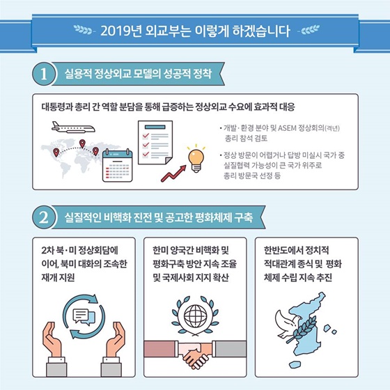 [일간환경연합 장민주 기자]2019년 외교부는 이렇게 하겠습니다! 한반도 평화 정착 및 국제질서 대전환 등 각종 도전에 선제적·능동적으로 대응하기 위해 수립한 2019년 4대 역점 외교과제 및 2대 신규과제, 세부추진 계획들을 확인해 보세요.