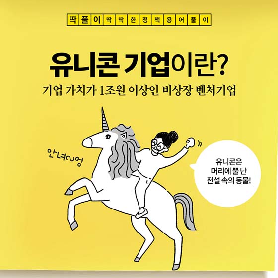 왜 ‘유니콘’이 등장할까요? 상장도 안 한 기업 가치가 1조원을 넘는 건 아주 놀라운 일인데요. 마치 상상 속 존재인 유니콘 같은 거죠!