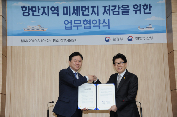 [일간환경연합 장영기 기자]해양수산부(장관 김영춘)와 환경부(장관 조명래)는 3월 19일 서울 청사(별관 브리핑룸)에서 항만지역 미세먼지 저감을 위한 업무협약을 체결했다 고 밝혔다.