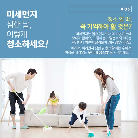 03. 청소할 때, 꼭 기억해야 할 것은?미세먼지는 일반 먼지보다 더 가볍고 눈에 보이지 않아요. 그래서 손이 닿는 바닥보다는 천장이나 벽면에 달라붙어 있는 경우가 많죠. 따라서 미세먼지 심한 날 청소할 때는 위에서 아래로 내려오는 ‘위아래 청소법’을 기억하세요!
