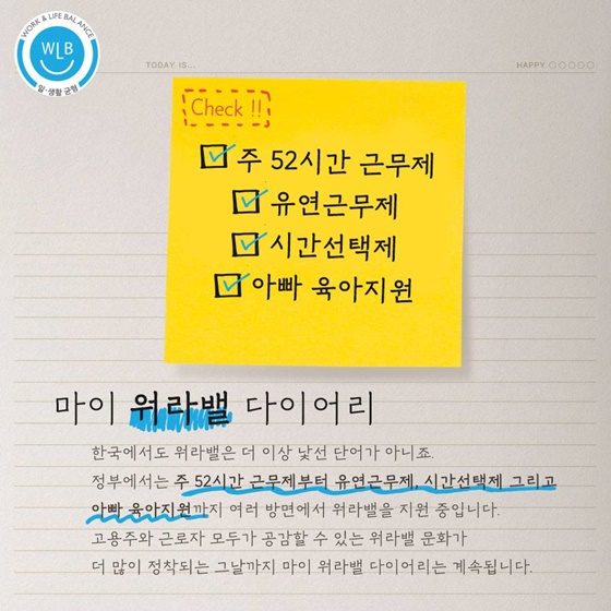 고용주와 근로자 모두가 공감할 수 있는 워라밸 문화가 더 많이 정착되는 그날까지 마이 워라밸 다이어리는 계속됩니다.