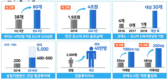 코스닥 상장 문턱은 미국 나스닥 수준으로 낮춰 3년동안 바이오·4차산업 분야 80개 기업의 상장을 추진하고, 7만개 주력산업·서비스기업의 사업재편 지원 및 17만명의 고용창출을 이끌어 낸다.