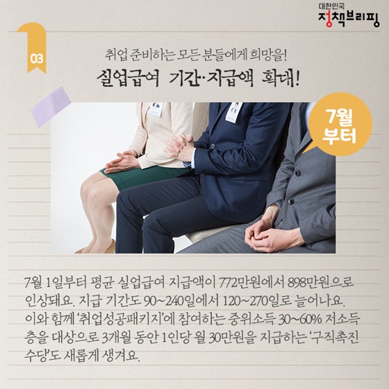 3. 실업급여 기간·지급액 확대! (7월부터)7월 1일부터 평균 실업급여 지급액이 772만원에서 898만원으로 인상돼요. 지급 기간도 90~240일에서 120~270일로 늘어나요. 이와 함께 ‘취업성공패키지’에 참여하는 중위소득 30~60% 저소득층을 대상으로 3개월 동안 1인당 월 30만원을 지급하는 ‘구직촉진수당’도 새롭게 생겨요.