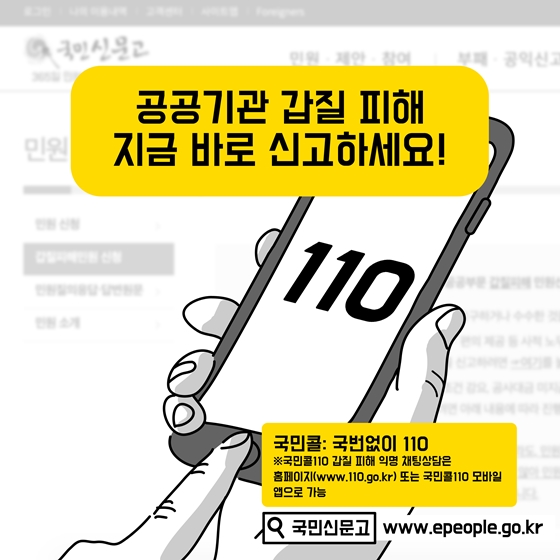공공기관에서 발생하는 △법령 등 위반 △부당한 인사 △기관 이기주의 △부당한 민원응대 △사적 이익 요구 △비인격적 대우 △업무 불이익 △기타 등 모든 갑질 행위, 용납하지 않겠습니다.