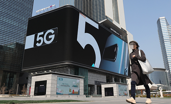 국내 이동통신사들이 세계 최초 일반용 5G 서비스를 조기 개통한 가운데 4일 오전 서울 강남구 한 건물 외벽에 설치된 디지털 사이니지에 5G 단말기 광고가 나오고 있다. (사진=(c) 연합뉴스) |