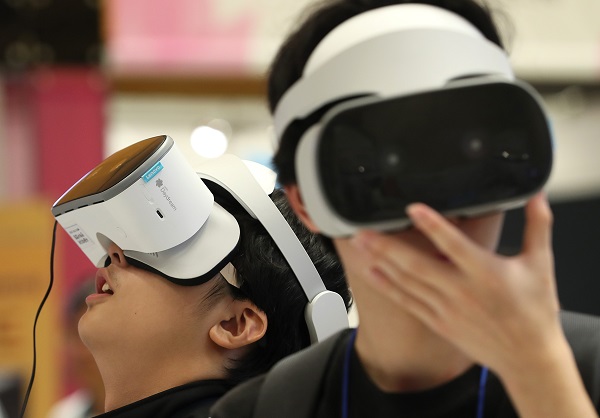 지난해 서울 강남구 코엑스에서 열린 ‘2018 이러닝 코리아 국제 박람회’를 찾은 학생들이 초등학교 수업용 실감형 콘텐츠를 VR체험하고 있다.(사진=(c) 연합뉴스) |