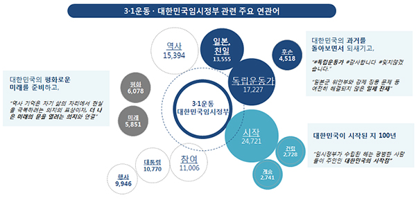 문화체육관광부 국민소통실은 지난해 9월부터 올해 3월까지 누리소통망(SNS) 게시물 11만여 건을 바탕으로 ‘3.1운동 및 대한민국 임시정부’에 대한 거대자료(빅데이터)를 분석한 결과를 발표했다.