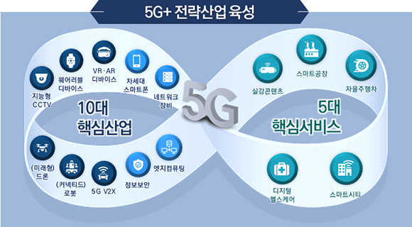 이날 과학기술정보통신부 등 10개 관계부처는 5G+ 전략산업으로 10대 핵심산업과 5대 핵심서비스를 선정하면서 이에 대한 중점투자를 통해 5G 기반 신산업을 육성하겠다고 밝혔다.