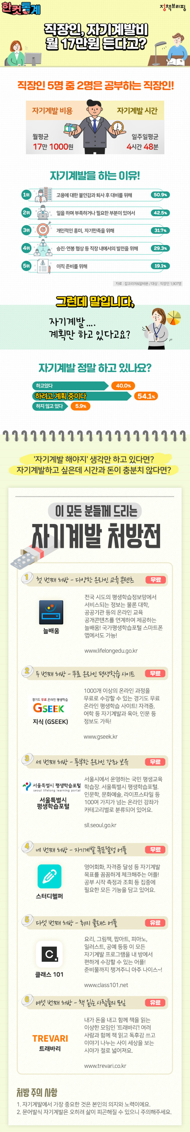 잡코리아와 알바몬에 의하면 직장인 5명 중 2명은 ‘공부하는 직장인’이며 자기계발 비용은 월평균 17만 1000원, 자기계발 시간은 일주일 평균 4시간 48분이라고 합니다.