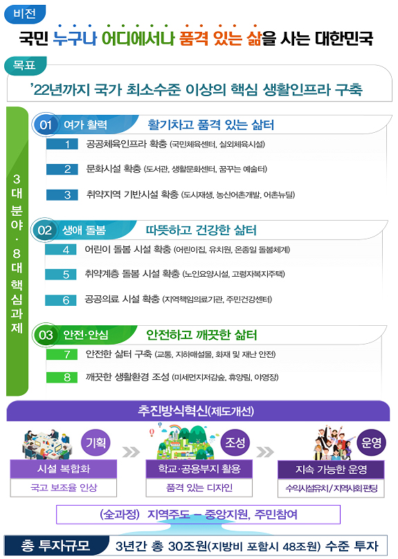 그동안 성장위주의 인프라 투자를 통해 국민소득은 3만달러 수준에 도달했으나, 취약한 생활 인프라 등으로 인해 국민이 일상 생활에서 체감하는 삶의 질은 미흡한 상황이다.