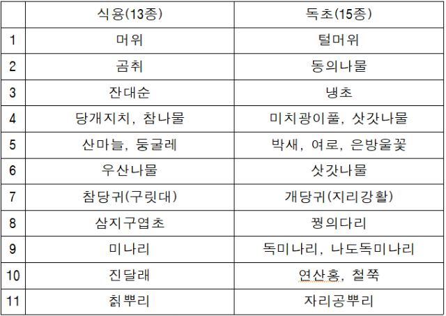 특히 이들 독초는 이른 봄철 새싹이 나는 시기에 식용하는 산나물 13종과 생김새가 서로 비슷해 중독사례가 발생하고 있다. 또한 일부 독초는 식물이름에도 나물이 들어가는 등 혼란을 준다.