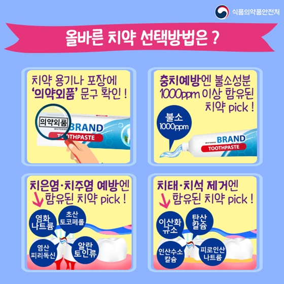 - 충치예방엔 불소성분 1000ppm 이상 함유된 치약 선택
