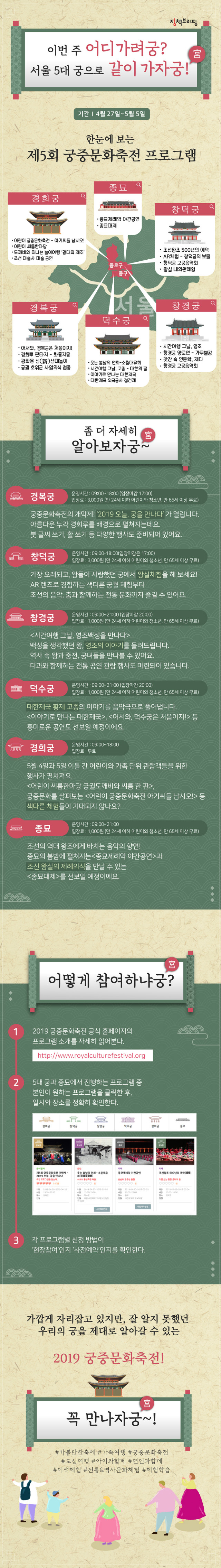 경복궁, 창덕궁, 창경궁, 덕수궁, 경희궁까지 조선 5대 궁궐과 종묘에서 다양한 체험 프로그램들이 준비되어 있어요. 가족과 함께, 연인과 함께, 친구와 함께 같이 가자궁~