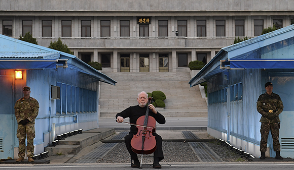 미국 첼리스트 린 하렐(Lynn Harrell)이 27일 비무장지대 공동경비구역(JSA)에서 열린 판문점 선언 1주년 기념식에서 공연을 하고 있다. (사진=(c) 연합뉴스)