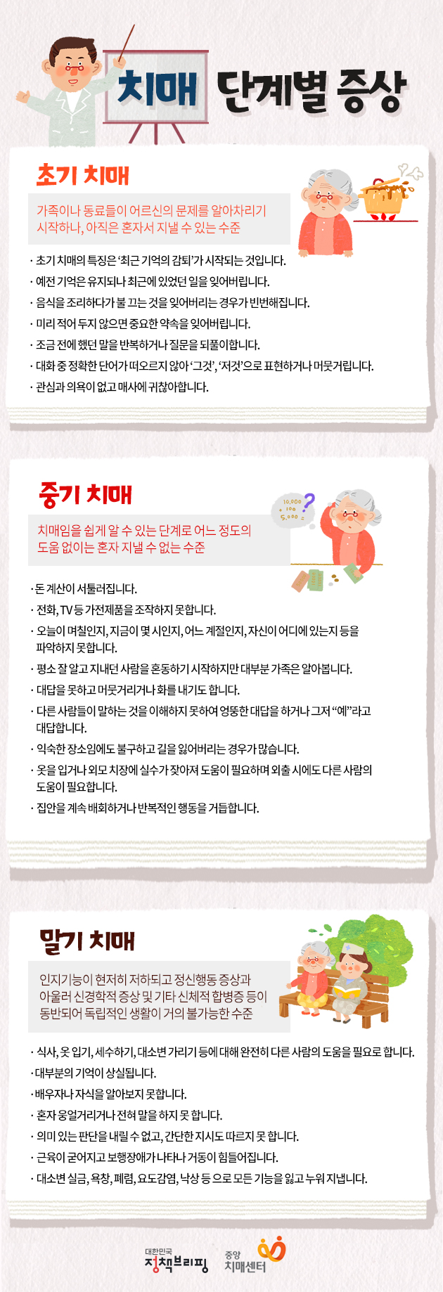 치매의 증상은 초기, 중기, 말기의 3단계로 나뉘는데 각 단계의 구체적인 내용은 아래와 같다. 가족이나 주변에 치매가 의심된다면 증상을 체크해보자.