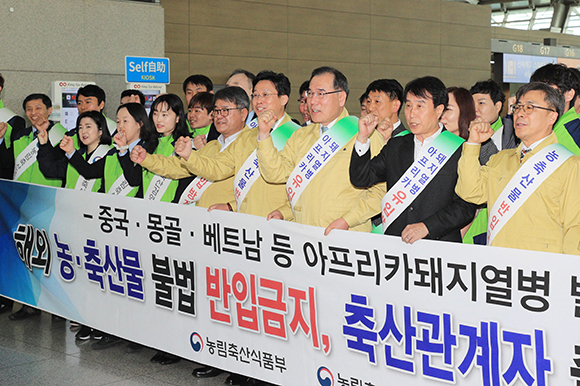 우리나라로 입국하는 모든 항공기에 기내방송을 통해 축산물 휴대 반입 금지 및 입국 시 자진신고를 독려하고, 해외에서 귀국 시 돼지고기 및 돼지고기가 포함된 제품 등 축산물을 절대 반입하지 않도록 일반 여행객에게 주의를 촉구했다.