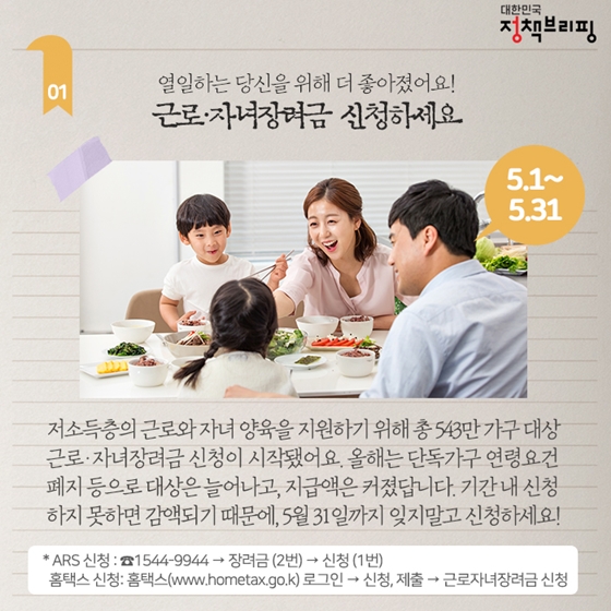 1. 근로·자녀장려금 신청하세요 (5.1~5.31)저소득층의 근로와 자녀 양육을 지원하기 위해 총 543만 가구 대상 근로·자녀장려금 신청이 시작됐어요. 올해는 단독가구 연령요건 폐지 등으로 대상은 늘어나고, 지급액은 커졌답니다. 기간 내 신청하지 못하면 감액되기 때문에, 5월 31일까지 잊지말고 신청하세요!