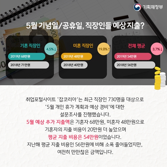5월 예상 추가 지출액은 기혼자 68만원, 미혼자 48만원으로 기혼자의 지출 비용이 20만원 더 높았으며, 평균 지출 비용은 54만원이었습니다. 지난해 평균 지출 비용인 56만원에 비해 소폭 줄어들었지만, 여전히 만만찮은 금액입니다.