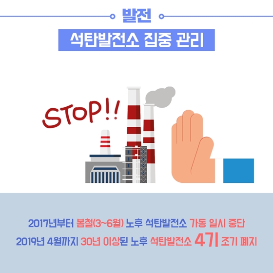 2017년부터 봄철(3~6월) 노후 석탄발전소 가동 일시 중단했습니다. 2019년 4월까지 30년 이상 된 노후 석탄발전소 4기를 조기 폐지했습니다.