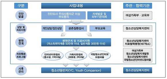 위험 단계별로 개인·집단 상담을 지원하고, 위험군 청소년에게는 우울증, 주의력결핍, 과잉행동장애 등 공존질환 추가검사를 실시해 질환 발견 시 의료기관 치료를 연계할 방침이다.
