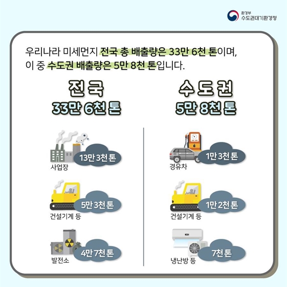 [일간환경연합 한선미 기자]미세먼지 배출원이란, 미세먼지를 대기 중으로 발생시키는 근원지를 말하는데요. 주요 배출원으로는 사업장, 자동차, 냉난방 등이 있습니다. 우리나라 미세먼지 전국 총 배출량은 33만 6천 톤이며, 이 중 수도권 배출량은 5만 8천 톤입니다.