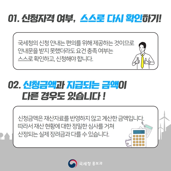 01. 신청자격 여부, 스스로 다시 확인하기 국세청의 신청 안내는 편의를 위해 제공하는 것이므로 안내문을 받지 못했더라도 요건 충족 여부는 스스로 확인하고, 신청해야 합니다.
