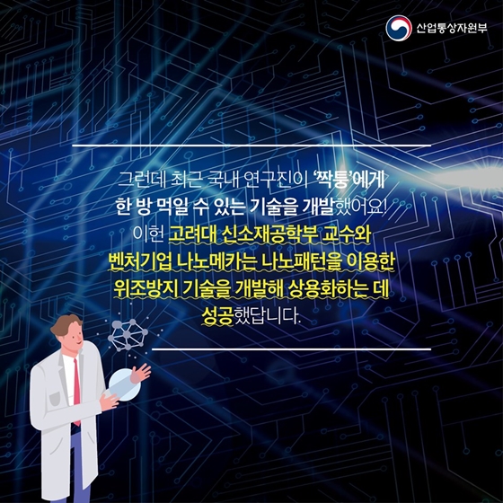 그런데 최근 국내 연구진이 ‘짝퉁’에게 한 방 먹일 수 있는 기술을 개발했어요. 이헌 고려대 신소재공학부 교수와 벤처기업 나노메카는 나노패턴을 이용한 위조방지 기술을 개발해 상용화하는데 성공했답니다.