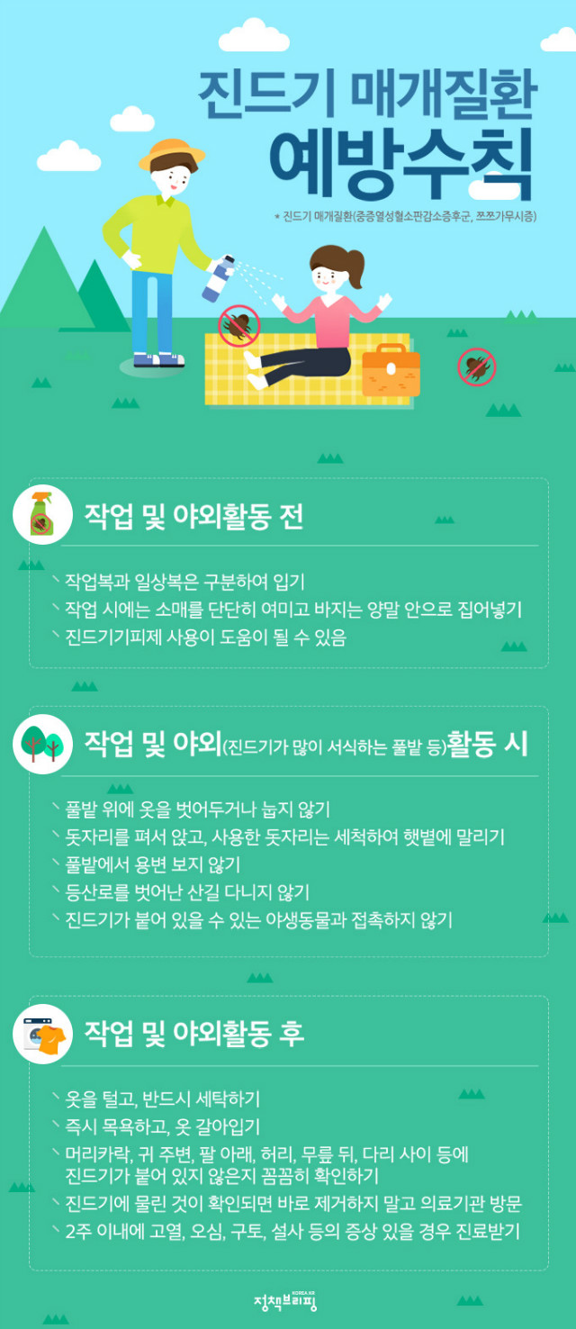 또한 야외활동 후 진드기에 물리지 않았는지 꼭 확인하고, 옷을 꼼꼼히 털고, 외출 후 목욕이나 샤워를 하는 것이 좋다. 야외활동 시 기피제를 사용하는 경우 일부 도움이 될 수 있으나, 피부 노출을 최소화하는 것이 더 중요하다.