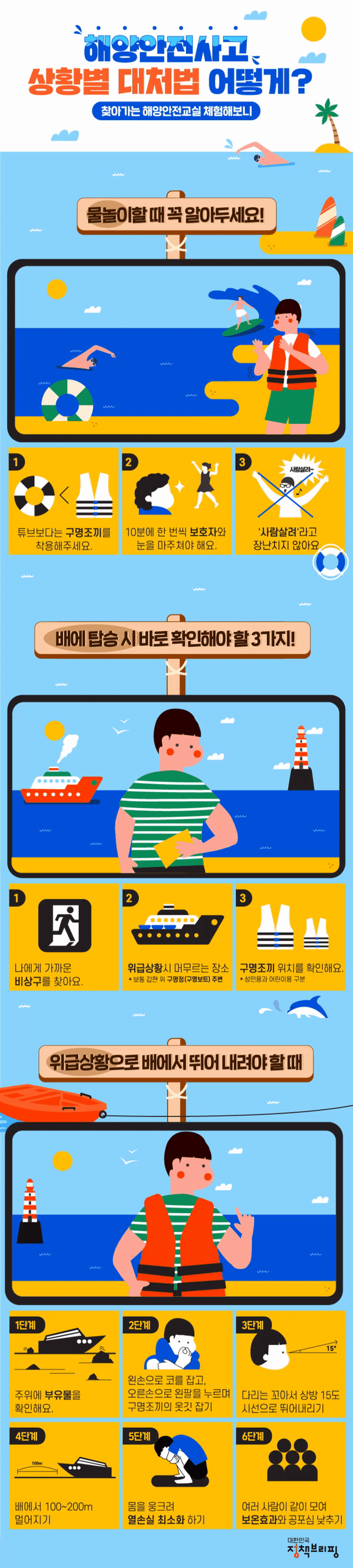 이 교육에서는 선박 탈출 순서 및 요령, 구명보트와 뗏목 탑승법, 구명장비 작동법, 구명조끼 착용법 등의 교육을 진행하고 있는데요. 찾아가는 해양안전교실에서 배울 수 있는 해양안전사고 대처법을 상황별로 정리했습니다. 인포그래픽으로 확인해보시죠!